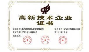 喜訊,重慶達(dá)康建筑工程有限公司順利通過重慶市科學(xué)技術(shù)局、重慶市財政局、國家稅務(wù)總局重慶市稅務(wù)局等部門的聯(lián)合評審驗收,被正式認(rèn)定為“高新技術(shù)企業(yè)”,榮獲《高新技術(shù)企業(yè)證書》。